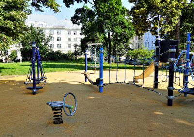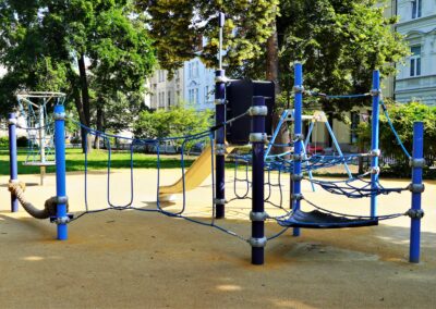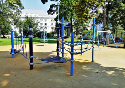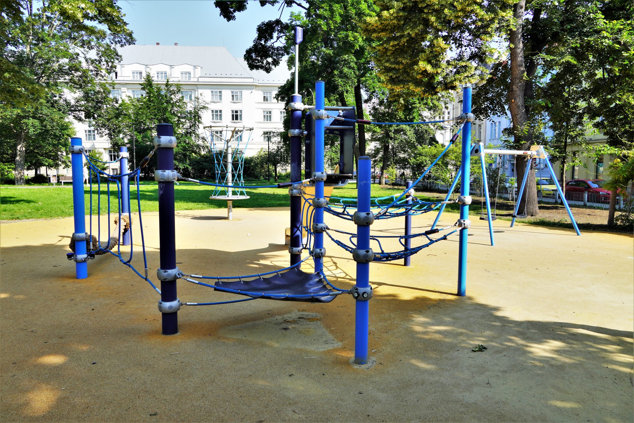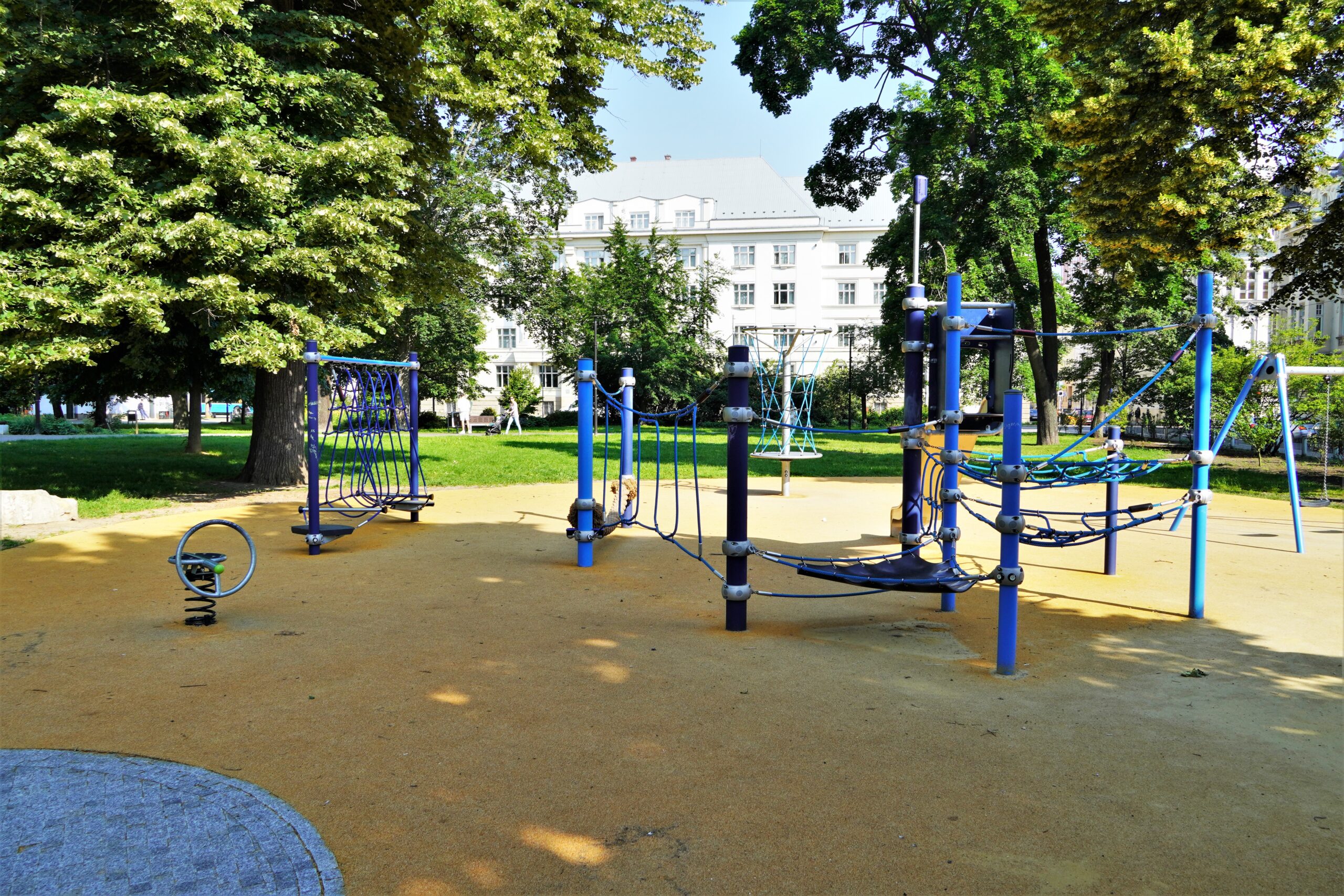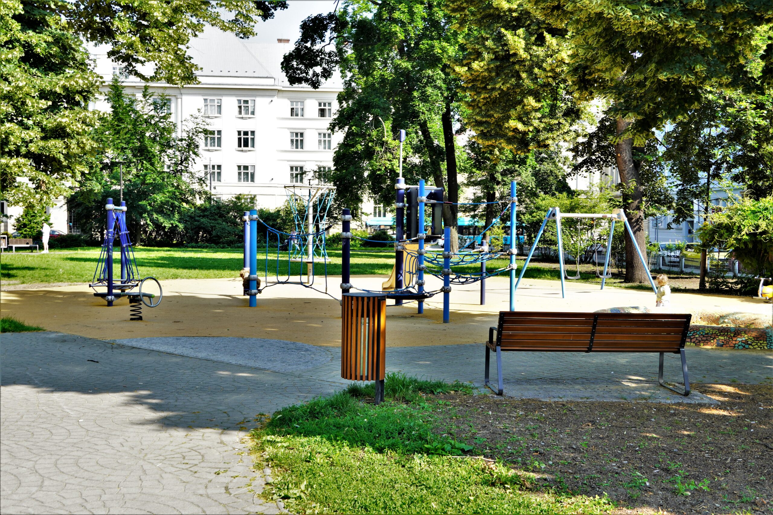 Stavba řeší odstranění stávajících nevyhovujících dětských prvků a dalších prvků/konstrukcí a výstavbu soudobého veřejně přístupného dětského hřiště. Různorodost navržených herních prvků pokrývá podstatné oblasti zájmů dětí všech věkových kategorií. Zároveň jsou zvoleny herní prvky v provedení lanových konstrukcí tak, aby svou subtilní konstrukcí pohledově nenarušovaly sadovnicko-architektonický výraz okolní zeleně v prostředí městské památkové zóny. Dispozičně jsou herní prvky i pryžová dopadové plocha do relativně malého prostoru zakomponovány tak, aby nekolidovaly se vzrostlými stromy a nezasahovaly do jejich ochranných pásem. Stávající zpevněná plocha s pískovištěm, vzrostlé lípy a vedení veřejného osvětlení s ochrannými pásmy tvořily podstatné limitující faktory návrhu hřiště.